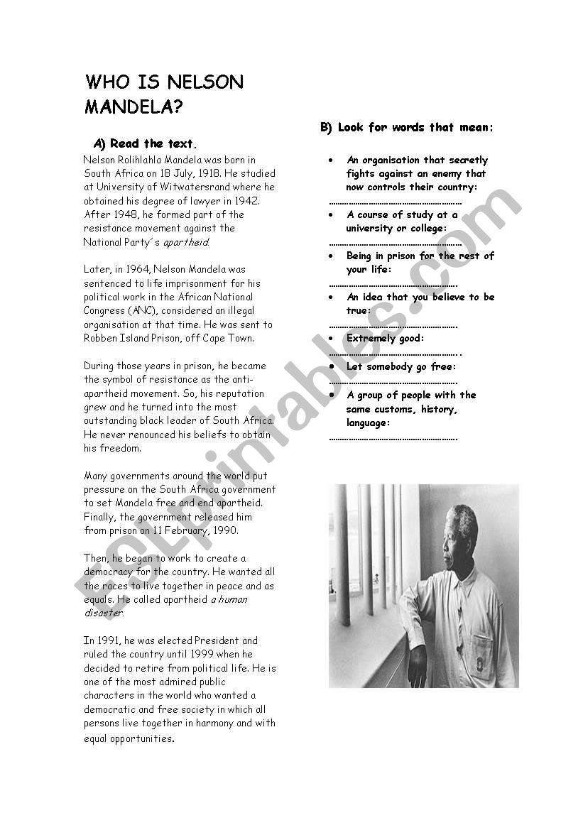This is a good reading so that your students learn more about an important character in the world, Nelson Mandela. They can also work vocabulary and writing. With Keys!!!!