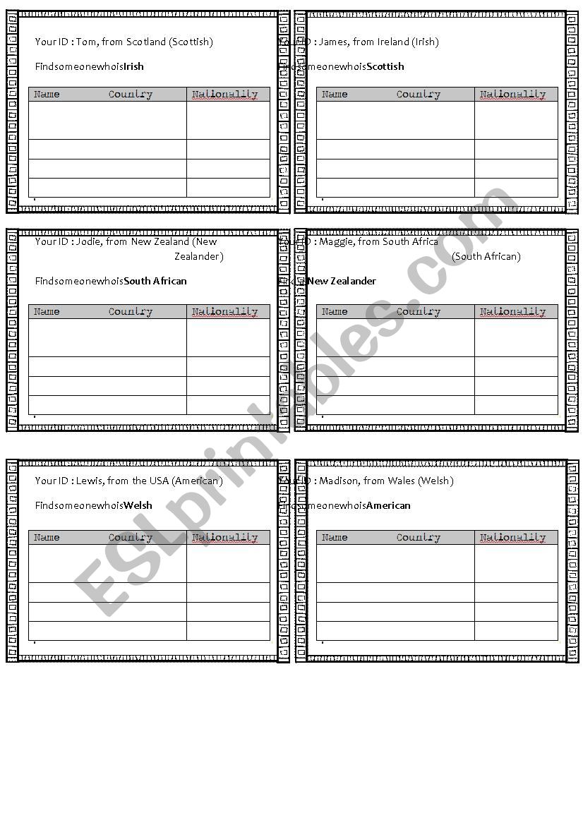 Students have a card with an identity (Name, Country, Nationality), they have to find someone from a certain nationality.