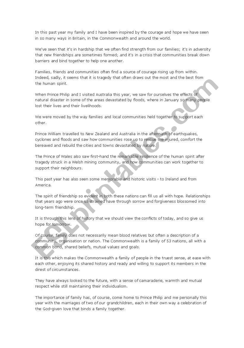 Very interesting activities about the Christmas message from the queen. First, you have the whole message and after one page exercises about it. Open you tube and play the message for you students to try to do the different activities. I hope you would like it