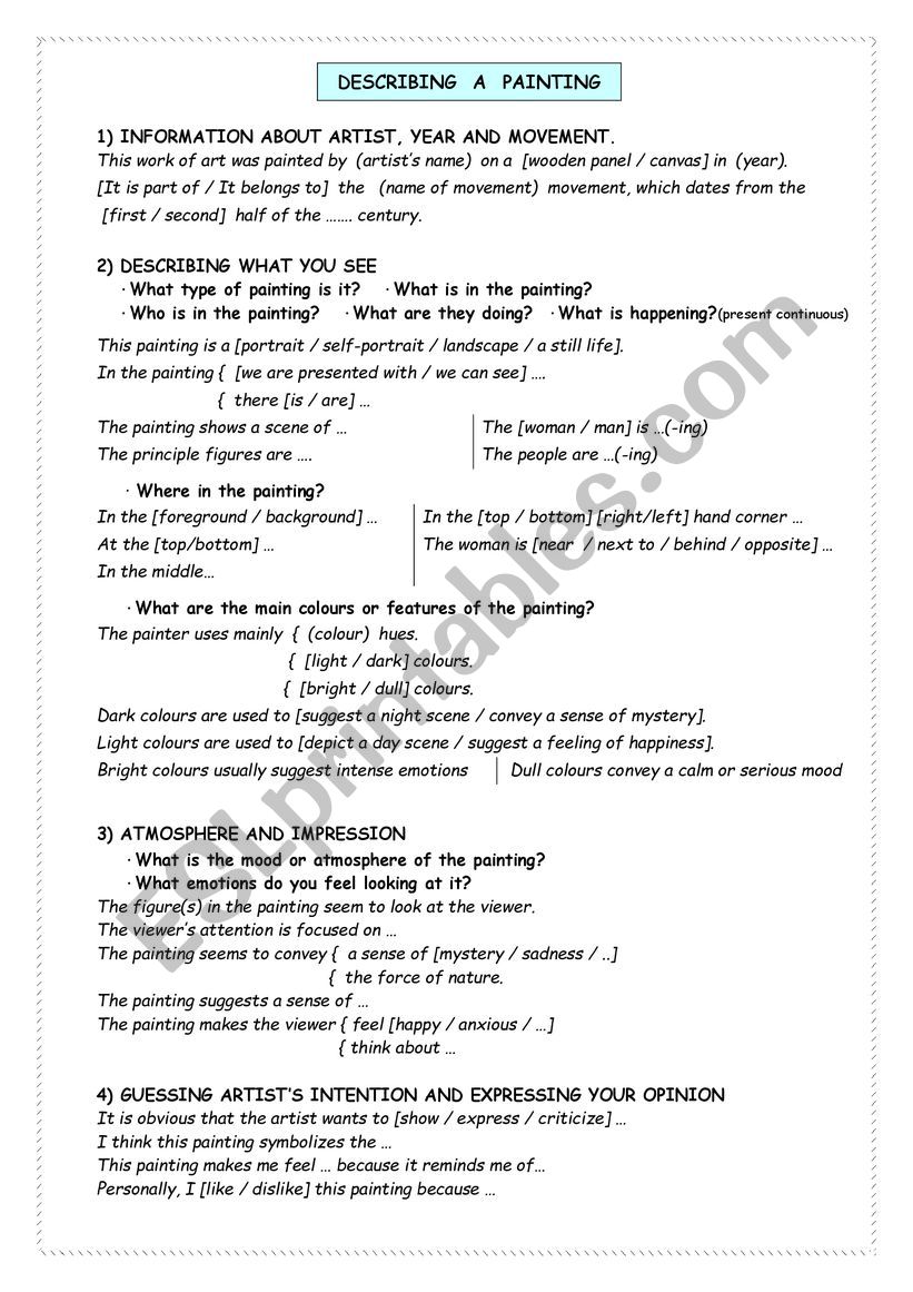 A worksheet to introduce vocabulary and expressions related to art and painting. It includes a gap-fill activity in the form of a description of the painting "Sunflowers" by Van Gogh.