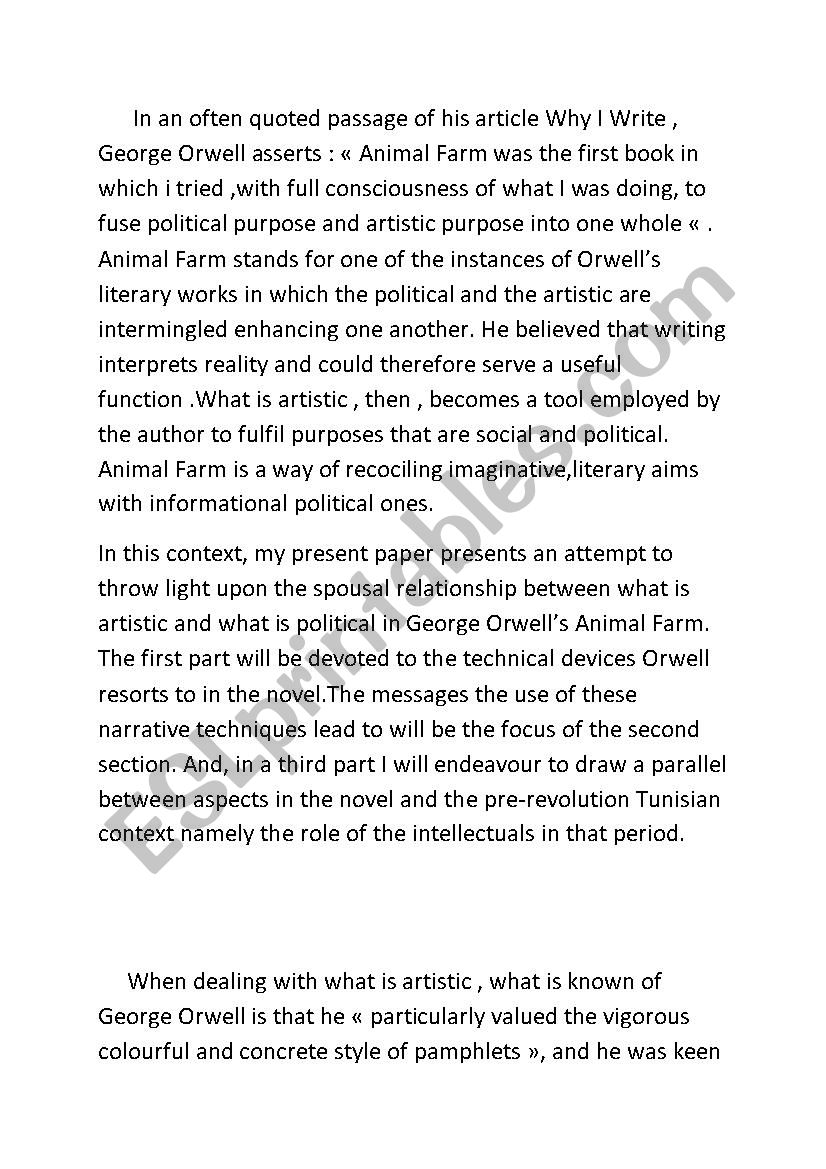 This is an article I have written to comment on George Orwell´s Animal Farm.I have attempted to comment on both the artistic and political levels of the novel as well as drawing a parallel between it and the pre-revolution situation in Tunisia.
