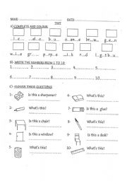This test deals with: - Colours (filling with the missing letters) - NUmbers (writing from 1 to 10) - School objects (questions: What´s this?, Is this a....?)