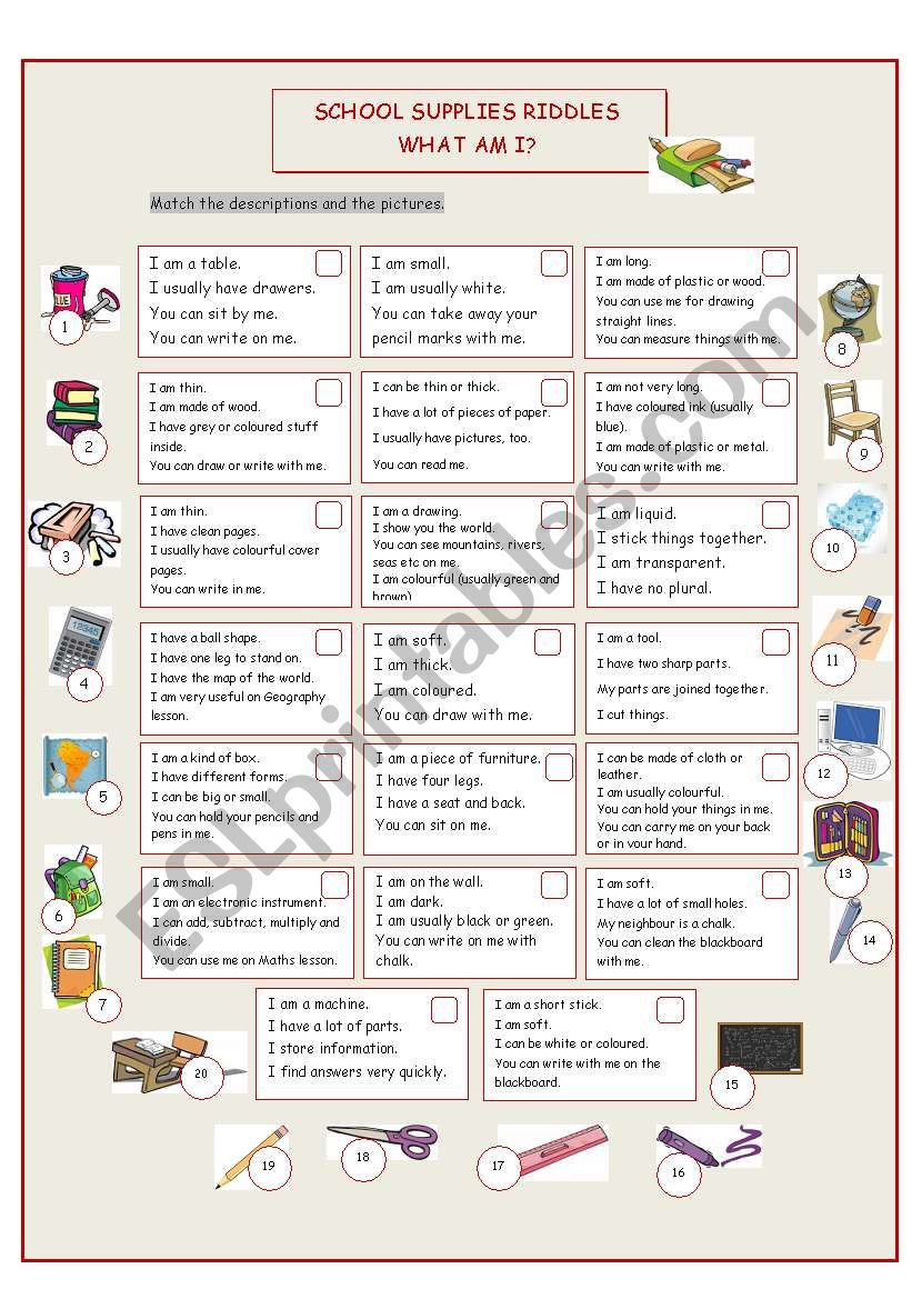 Vocabulary worksheets > School > School supplies > School Supplies Riddles (What Am I?)