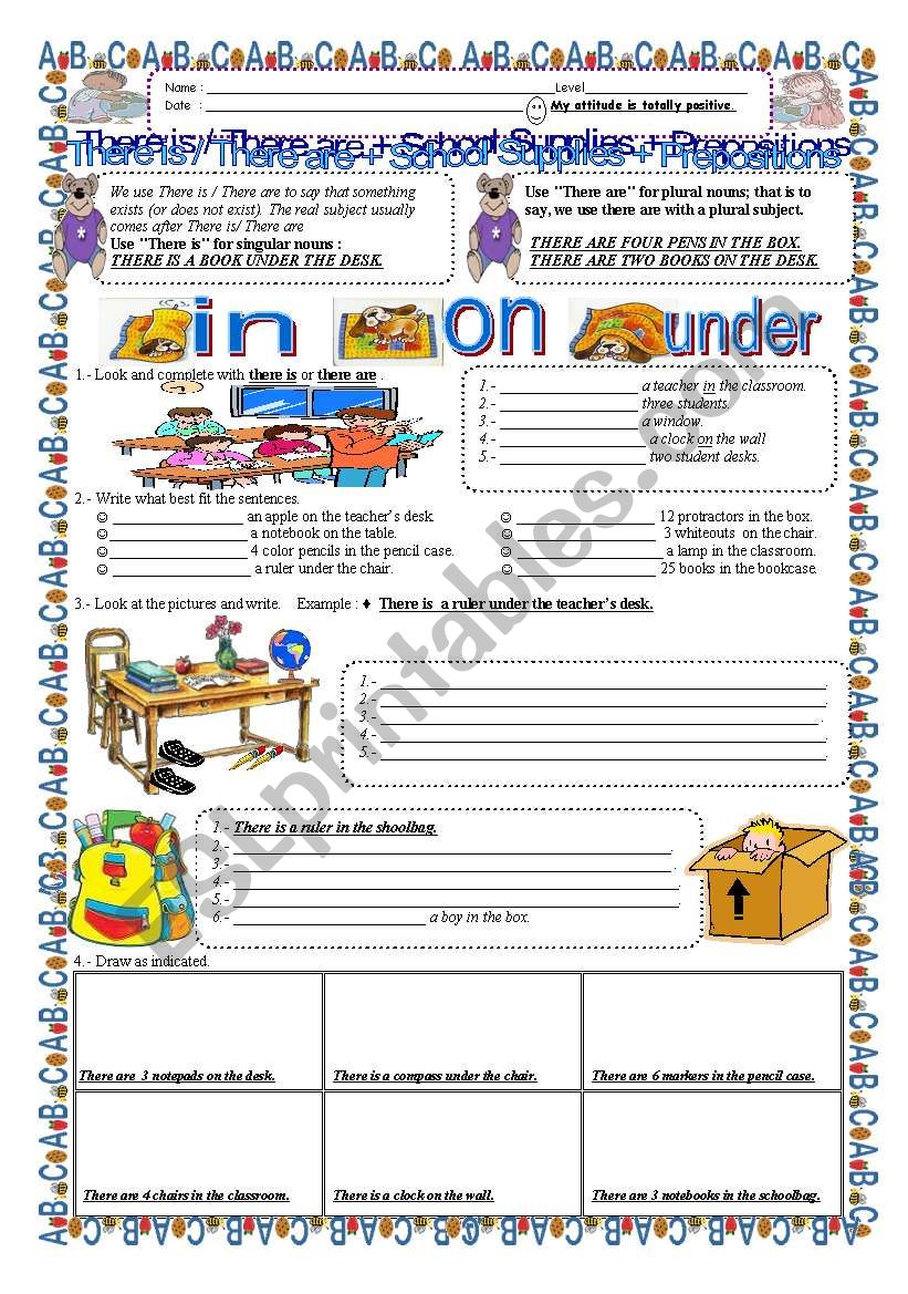 There is / There are +School Supplies + Prepositions