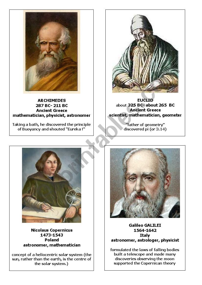 A set of 4 cards on very famous scientits with personal background information, important invention or discovery. Very useful to review the simple past and Wh-questions and a little bit of culture. Student A is given a card. Student B has to ask questions to fill in a form and guess who the mystery character is.