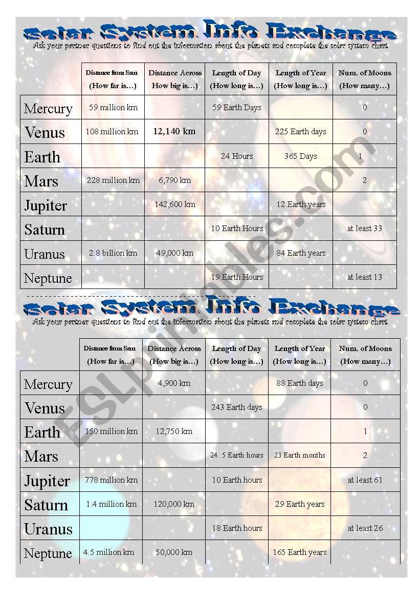 An information gap activity in which your students can ask and answer for the missing facts about the planets of our solar system. You can cut the page in half and give each half to opposite members of a pair. The kids really get excited about completing this! You can elicit the proper questions from them first, but theres also a short question prompt on the worksheet above the tables.