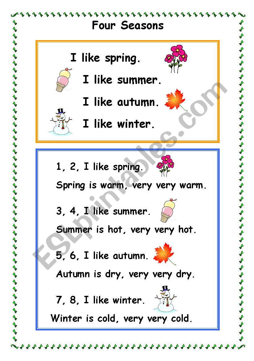 This chant is related to the topic of Seasons for the beginners. Students get to learn different weather conditions to describe each season. For interest, students may clap their hands and chant it happily with the numbers.