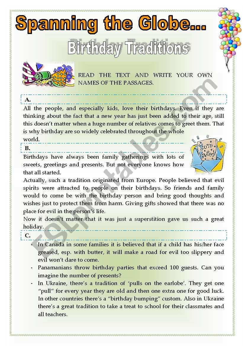 Spanning the Globe. Birthday Traditions. worksheet