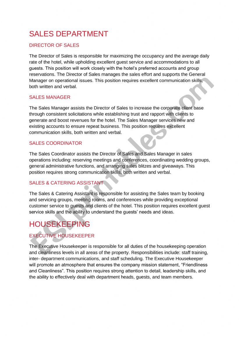 Hotel jobs reading activity (sales and housekeeping departments) worksheet