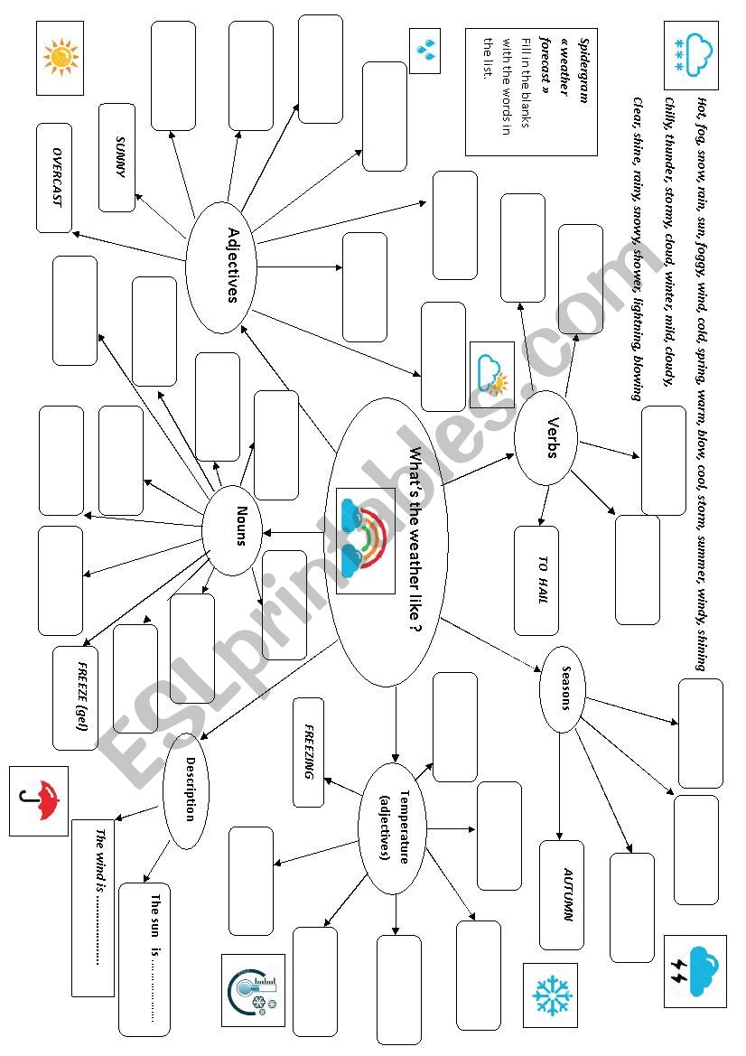 Spidergram : with grammatical categories. It´s easier for pupils to learn it. Weather : adjectives, nouns, verbs ...etc. Pupils have to fill in the blanks with the list of words in the upper part. They will notice that some words have different grammatical categories (snow : noun and snow : verb ...etc).