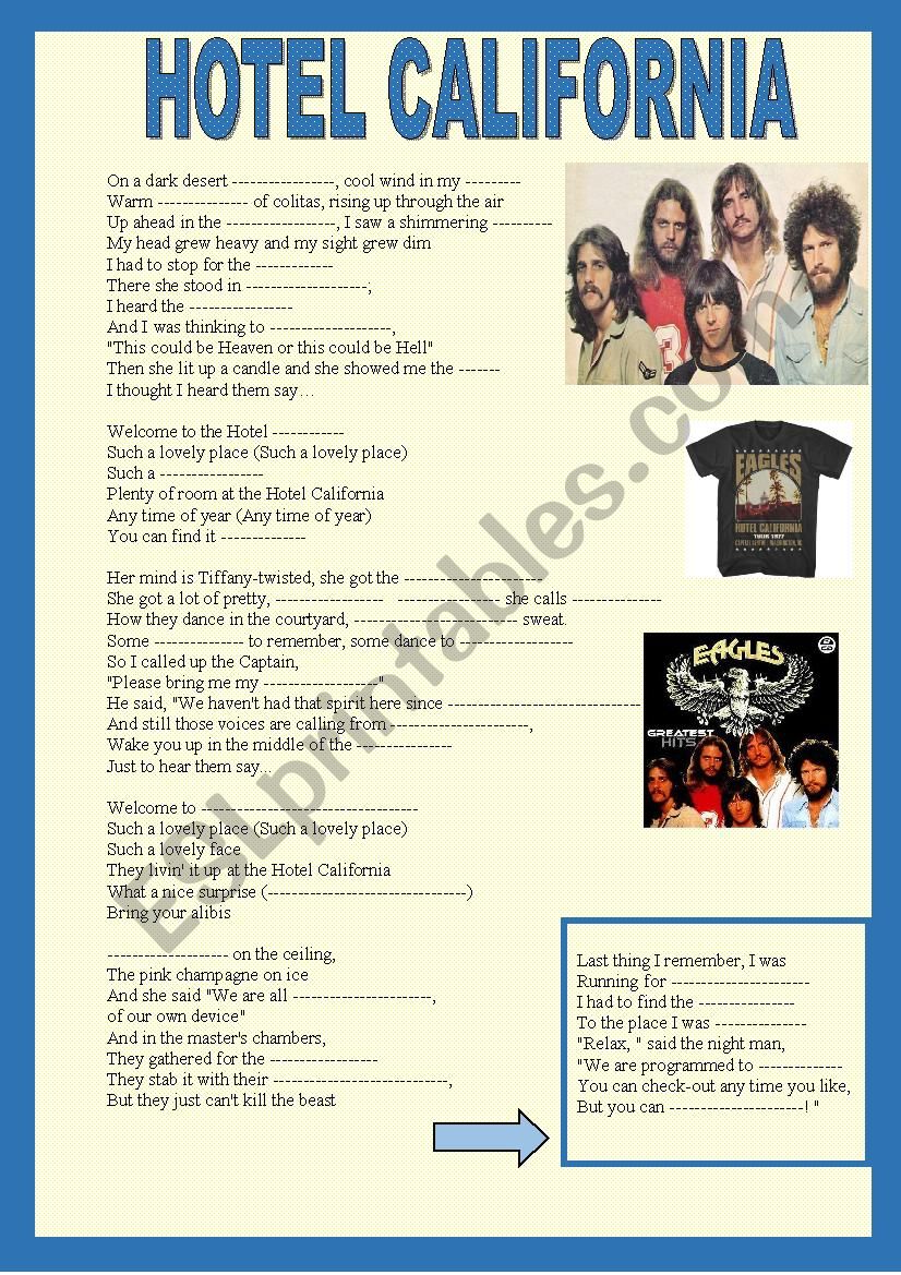 Here is an activity in which students have to fill the missing words and sing along the song I made it as atribute to one of my favourite bands and songs, I had uploaded it yesterday , but after an update it couldn´t get published so I am sending it back today, Hugs Sylvie!:)