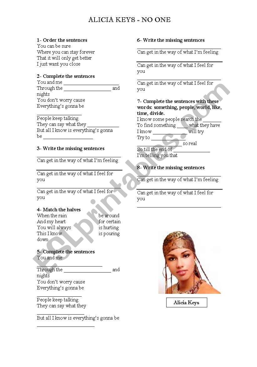 Worksheets with songs > Alicia Keys > No one, by Alicia Keys
