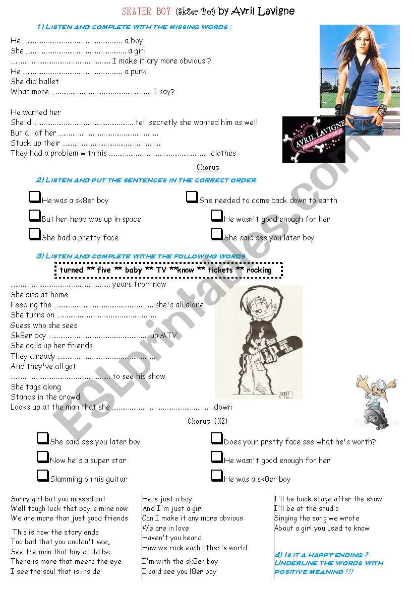 Activities on the song "Skater Boy" (Sk8er Boi) by Avril Lavigne: gap filling, putting the lyrics back in the correct order... Fun song to revise the Simple Present and the Simple Past!!! I personally used the acoustic version of the song...