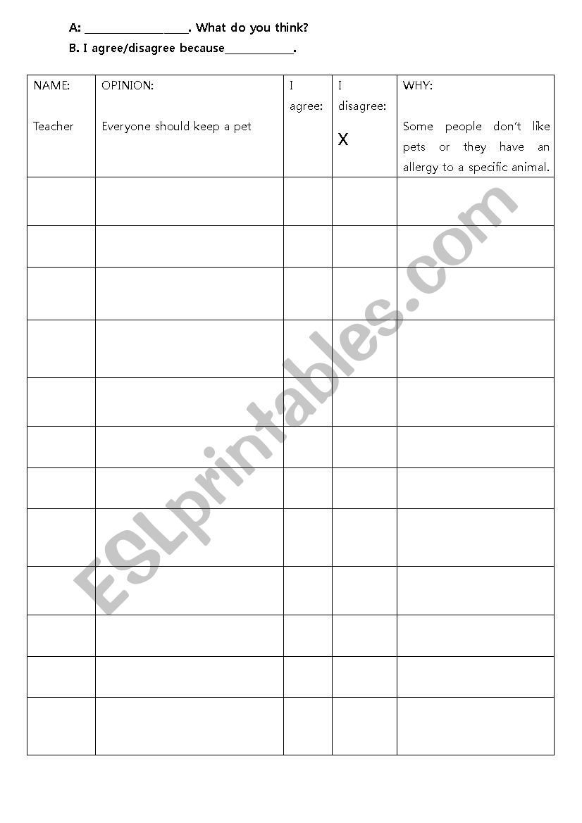 Opinion chart with an attached list of different topics for students to express opinions about. This is aimed for students to mingle and discuss different sentences/topics and then fill in the chart with different responses.