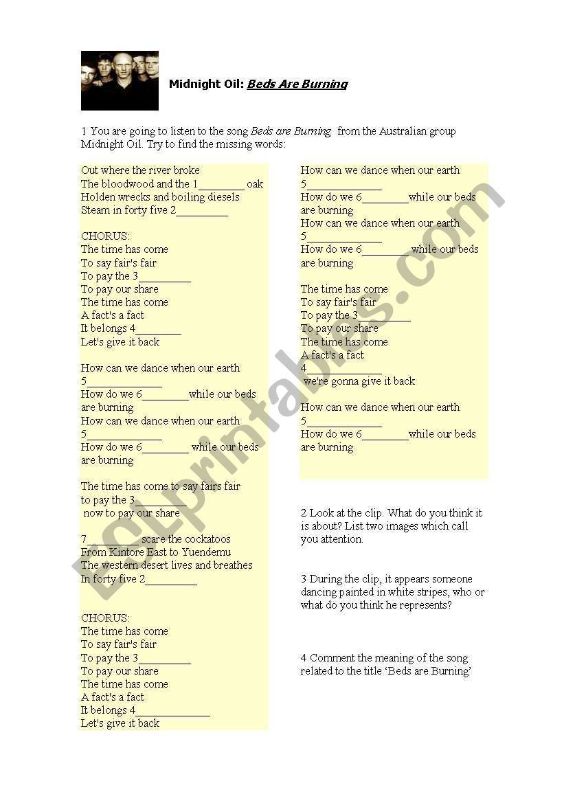 With this activity you can lear, through midnight´s Oil song, a little bit more about Australian culture: This is a political song about giving native Australian lands back to the the Pintupi, who were among the very last people to come in from the desert. These ´last contact´ people began moving from the Gibson Desert to settlements and missions in the 1930s. More were forcibly moved during the 1950´s and 1960´s to the Papunya settlement. In 1981 they left to return to their own country and established the Kintore community which is nestled in the picturesque Kintore Ranges, surrounded by Mulga and Spinifex country. It is now a thriving little community with a population of about 400.