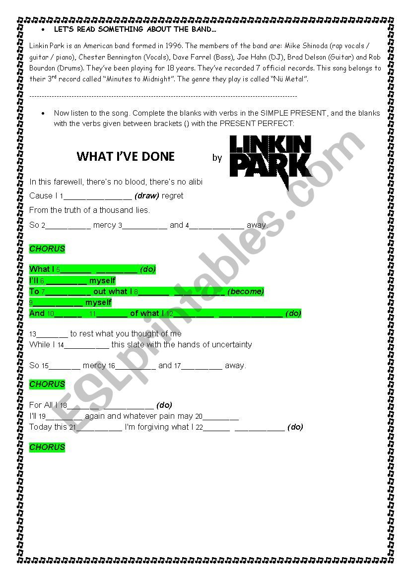This is an exercise to practice PRESENT PERFECT and revise verbs in the Present Simple. The song is very simple and repetitive, it works really well when we start teaching this topic. Apart from this, when you finish the activity you can add a speaking activity, Ss can say what they think the song means.