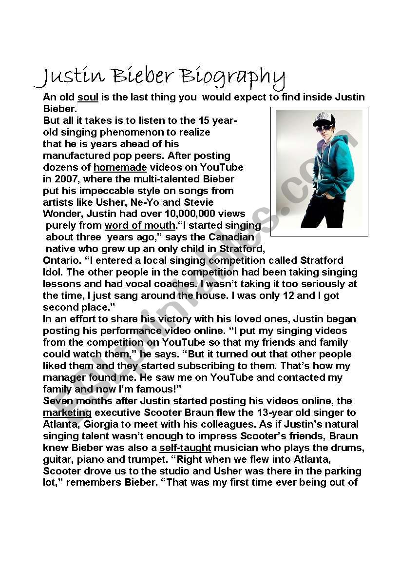 This is a nice Reading Comprehension exercises based on Justin Bieber´s life. My 6th formers really enjoyed it!
