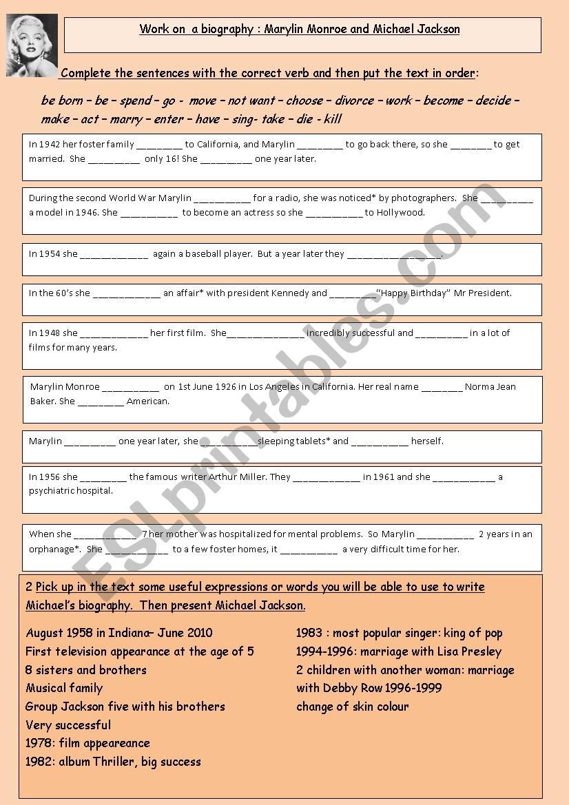 Marylin Monroe´s and Michael Jackson´s biographies.The worksheet is not visually appealing but my students really enjoyed the activities.
