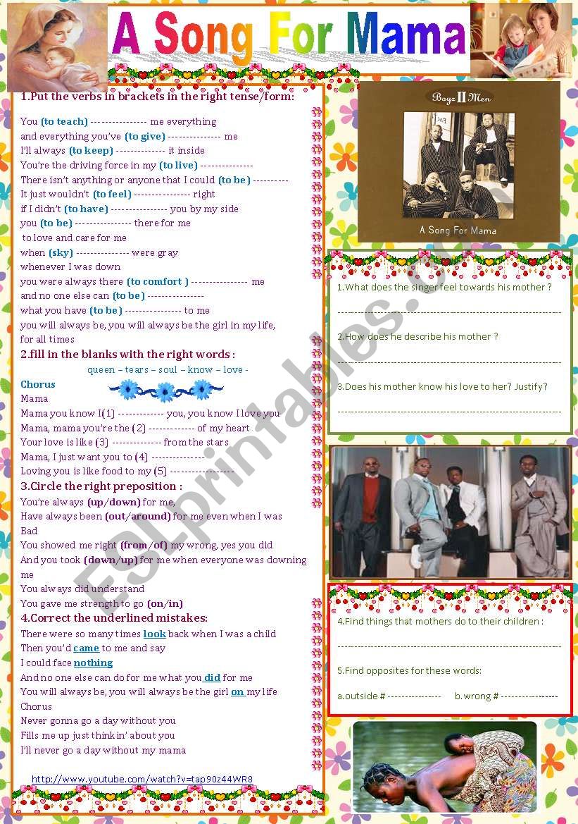 it´s a beautiful song : a song for Mama by Boys 2 Men; some activities; comprehension questions;The song´s link is included; hope you find it useful !!