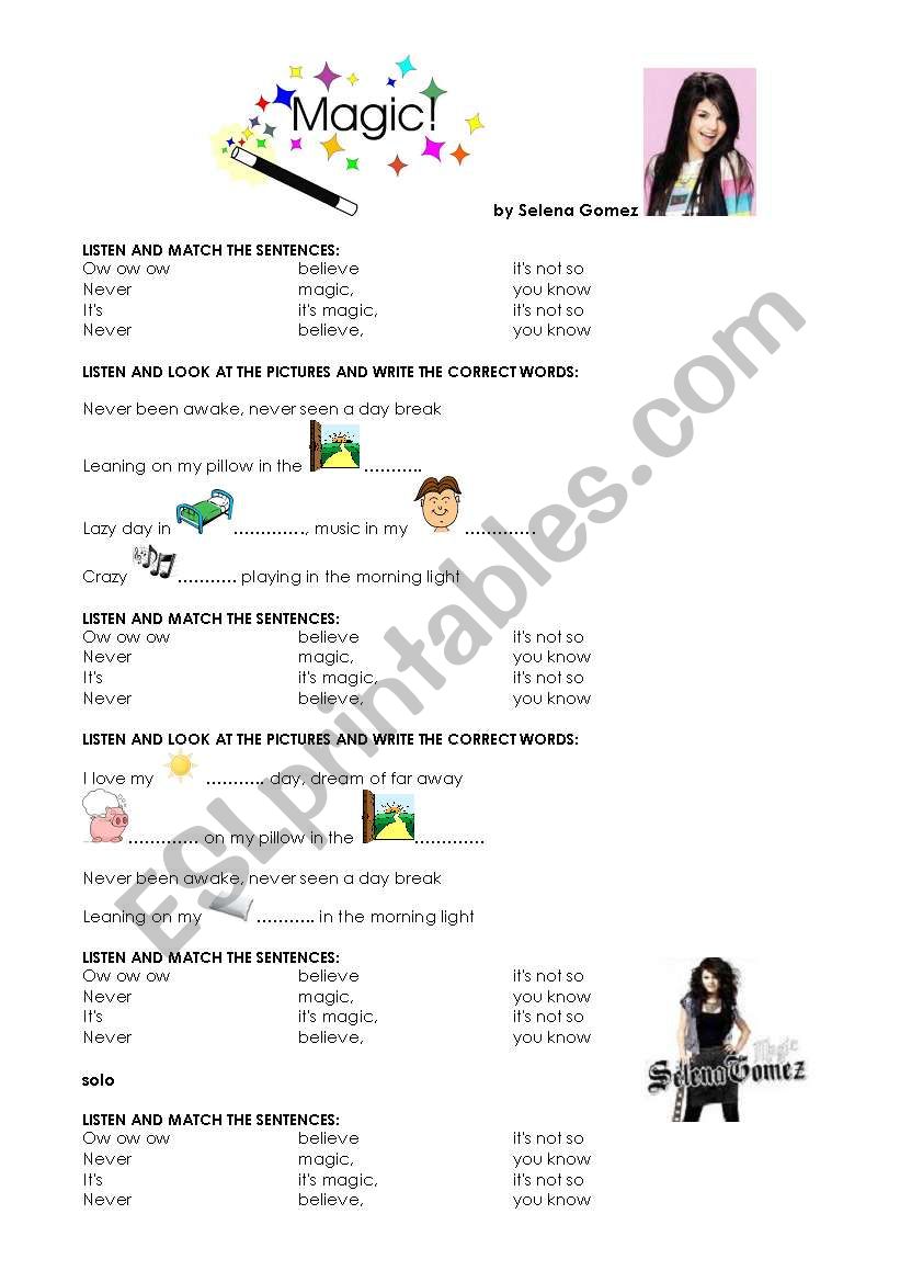 Students have to listen to the song and: First, match the sentences. Then look at the pictures and write the correct words. Enjoy it!