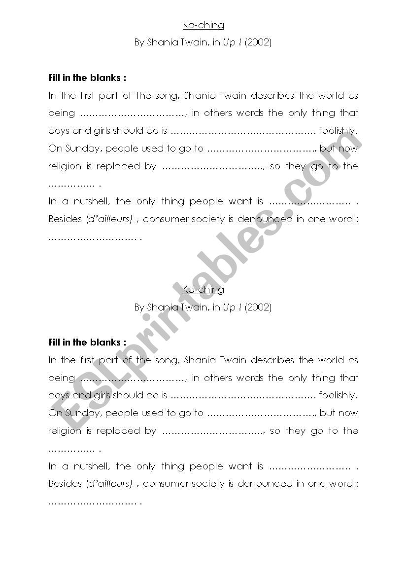This is a short summary you can use after the study of the song "Kaching" by Shania Twain (2002). It sums up the main idea the song denounces : consumer society.